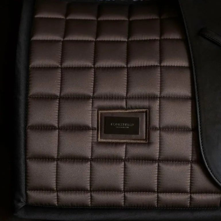 • Tapis de dressage sportif marron avec un matelassage carré sur le bas du tapis et d’une maille antidérapante noir sur le haut du tapis pour garantir la fixité de la selle lors de l’utilisation