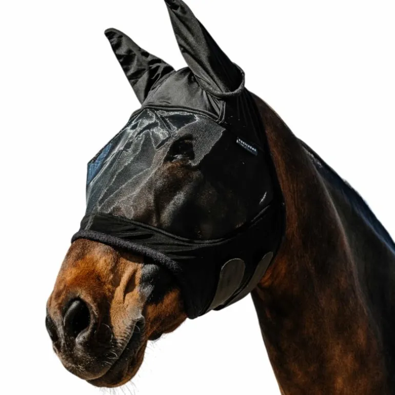 • Tissu mesh monté sur une base en lycra pour un ajustement parfait à la tête du cheval