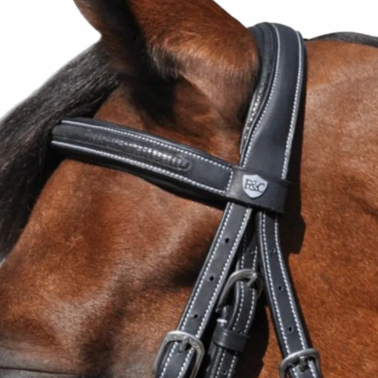 - Frontal et muserolle combinée, doublés et bombés 1/2 rond cuir brillant