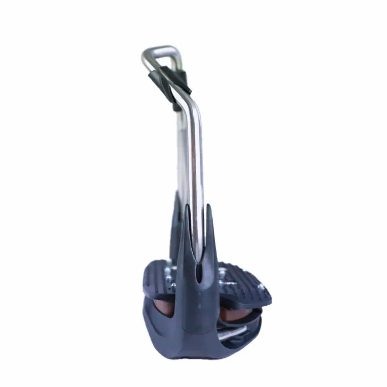 • L’étrier possède une position avancée de l’oeil par rapport au plancher permettant alors de décaler le centre de gravité et favorise la descente des talons