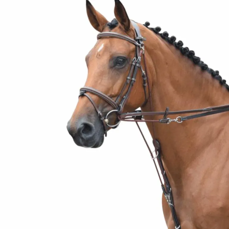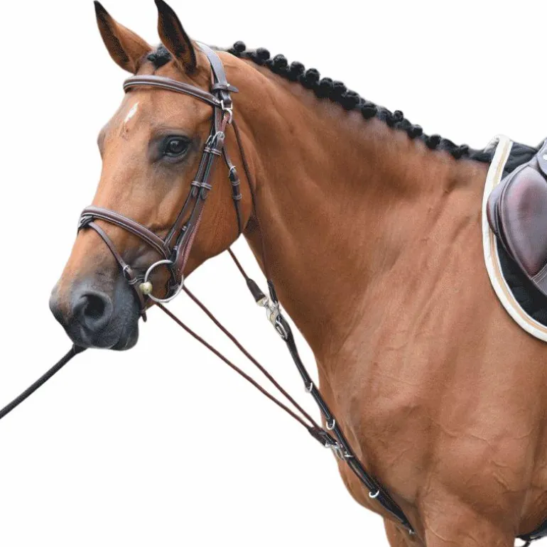 - Comme pour tous les enrênements, il est important de ne pas le régler trop court, particulièrement en début de séance, le but n’étant pas d’emprisonner le cheval ce qui provoquerait des défenses mais de fixer un cadre dans lequel le cheval peut se mettre en place librement.