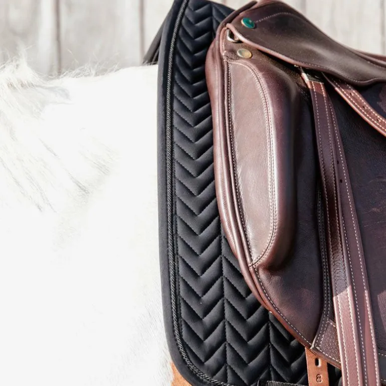 - Ce tapis de selle au matelassage Fishbone est fabriqué dans un matériau respirant (43% de nylon, 43% de polyester et 14% de spandex) et est dès lors, parfait pour la compétition ou l’entrainement à la maison. Vous pouvez d’ailleurs remplacer le patch avec les numéros par un patch au Logo Kentucky