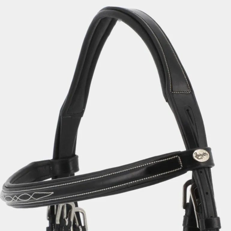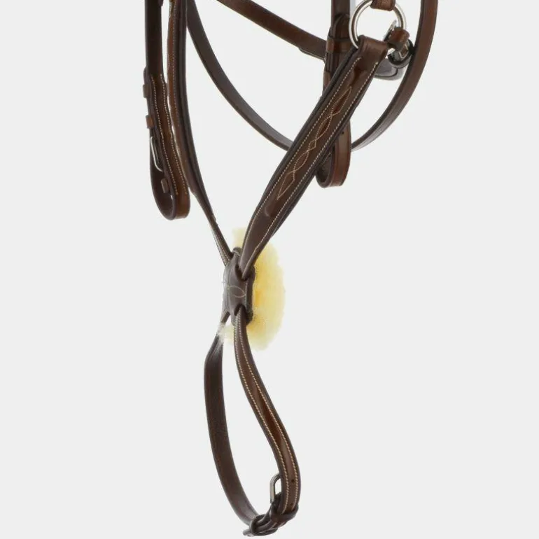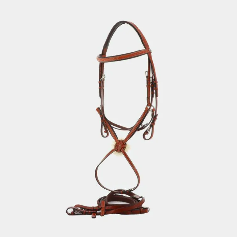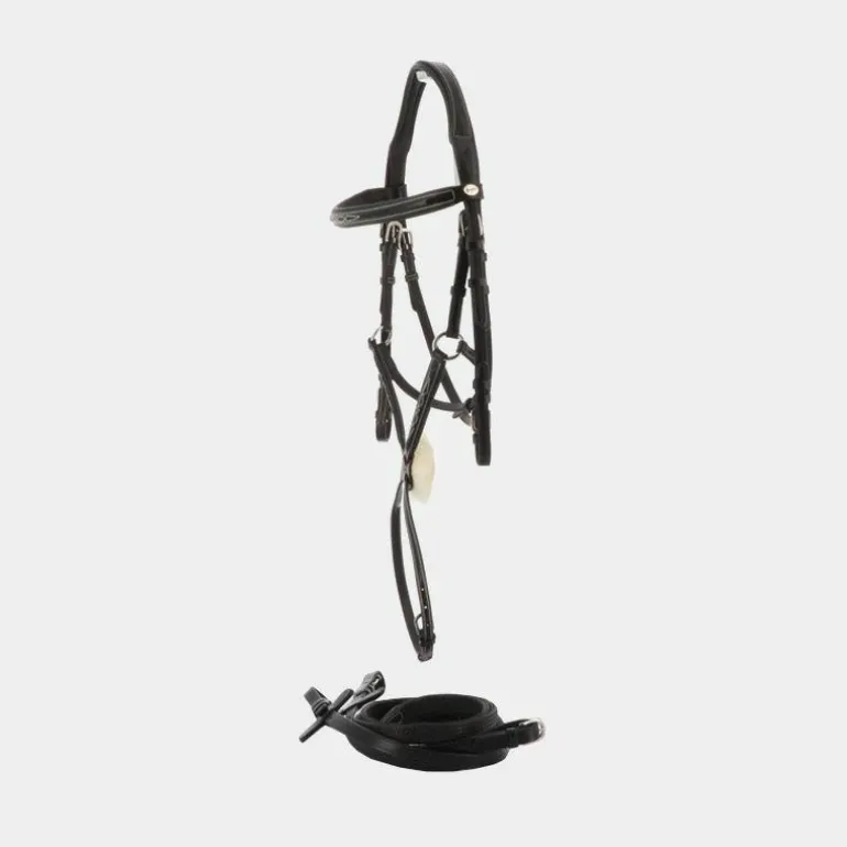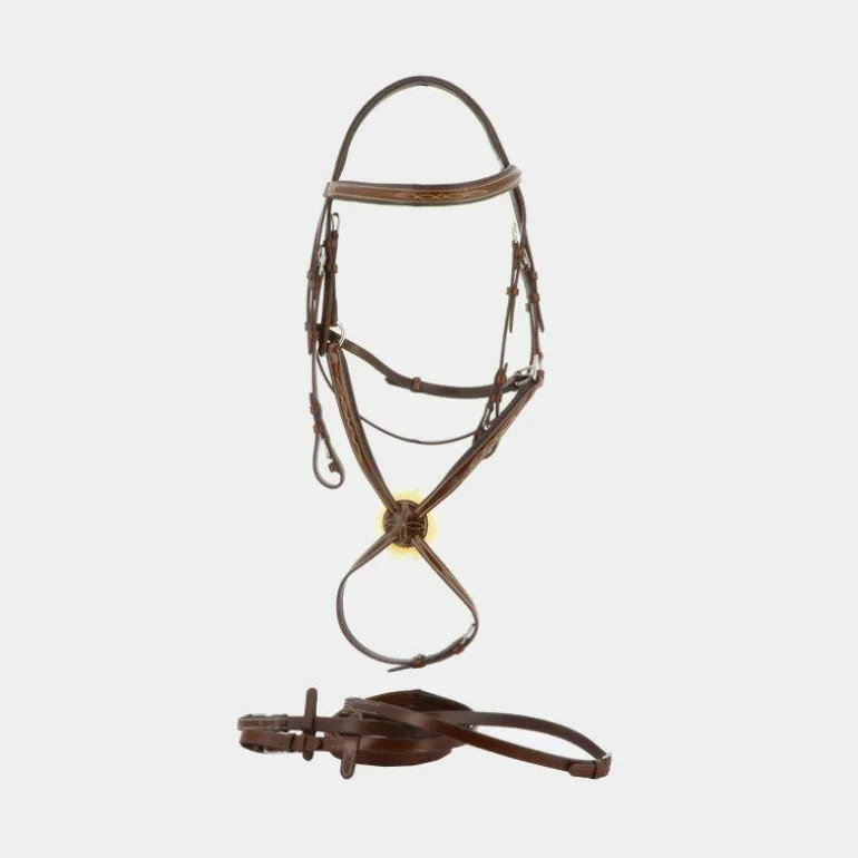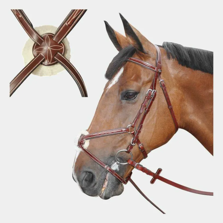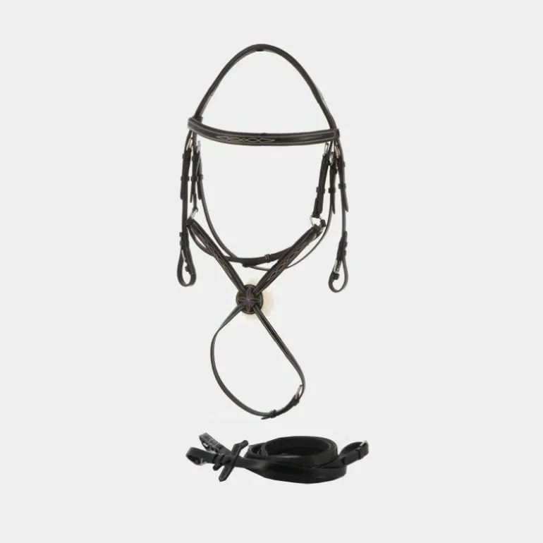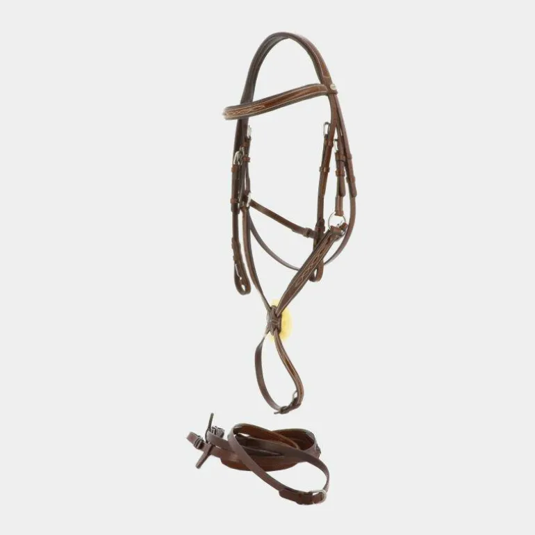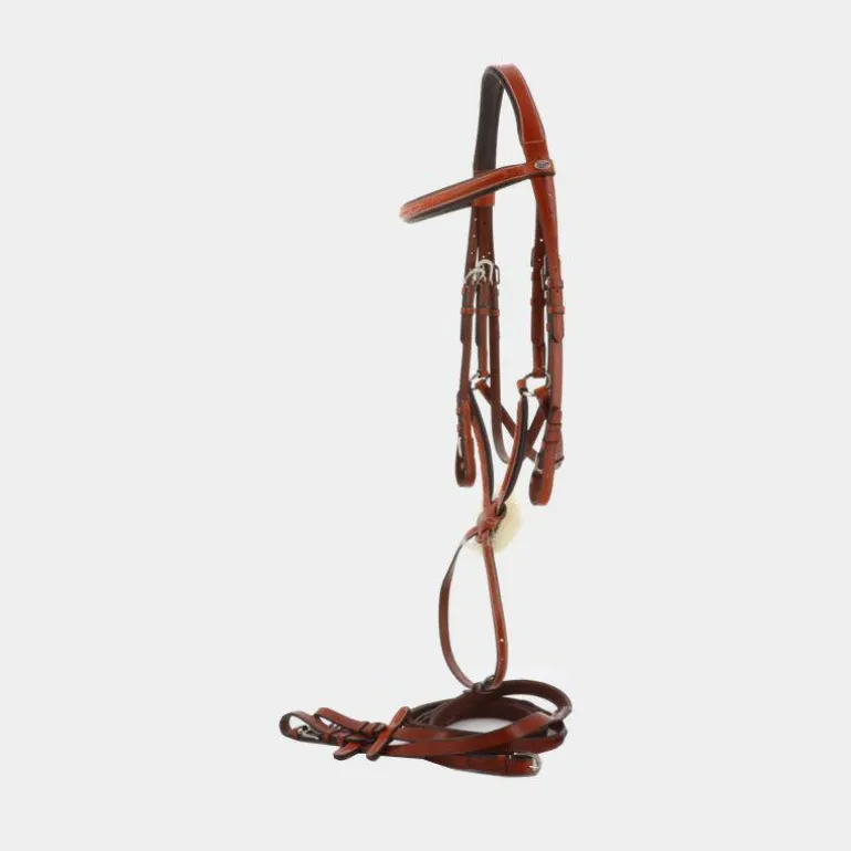 - Frontal et muserolle 1/2 rond, doublés et surpiqués. Têtiere anatomique doublée. Bouclerie inox. Livré avec rênes eventer.