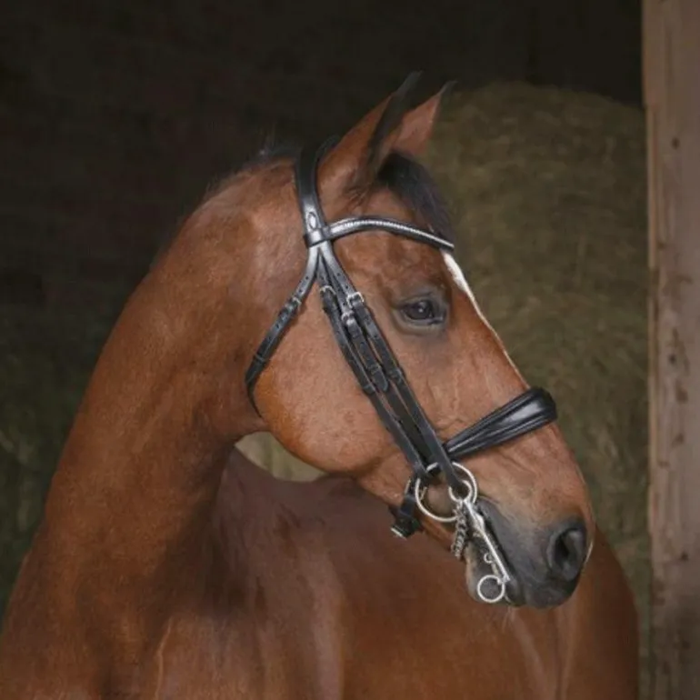 - Bride en cuir de buffle avec têtière et muserolle souple doublées cuir vachette, frontal avec incrustation de strass.