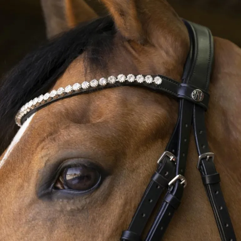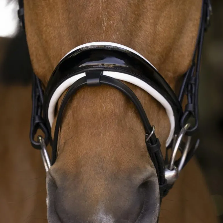 - Frontal fin décoré de strass et muserolle suédoise combinée aspect cuir vernis, doublés cuir vachette blanc