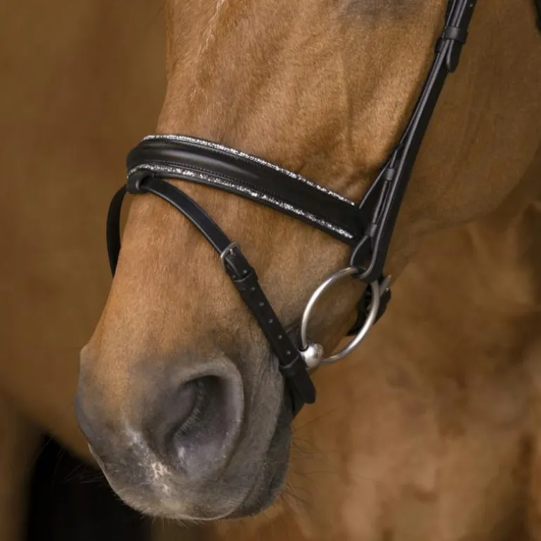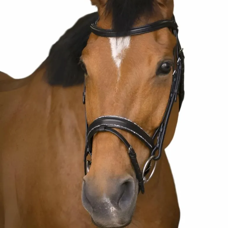 - muserolle surmontée en haut et en bas de fines bandes de petits strass, doublée cuir vachette.
