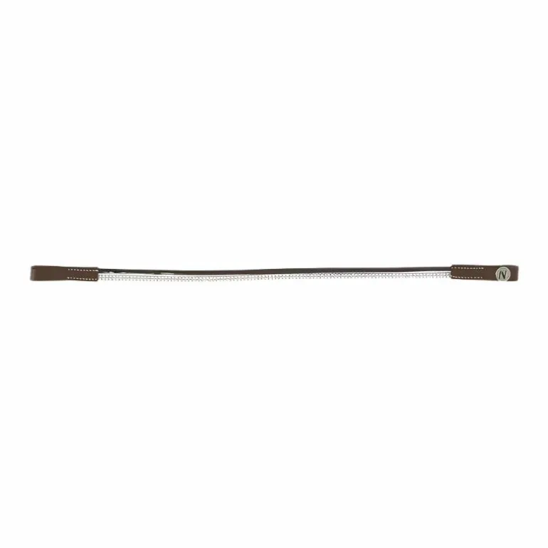 - Frontal en cuir de buffle avec deux lanières : une en polyuréthane aspect cuir vernis et une en polyester ornée de petits clous brillants.