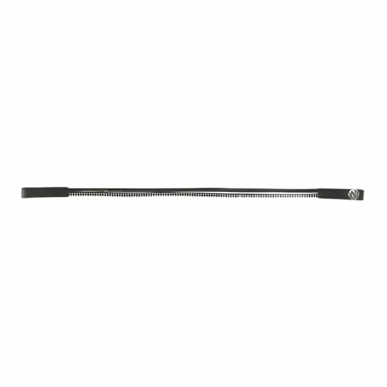 - Frontal en cuir de buffle avec deux lanières : une en polyuréthane aspect cuir vernis et une en polyester ornée de petits clous brillants.