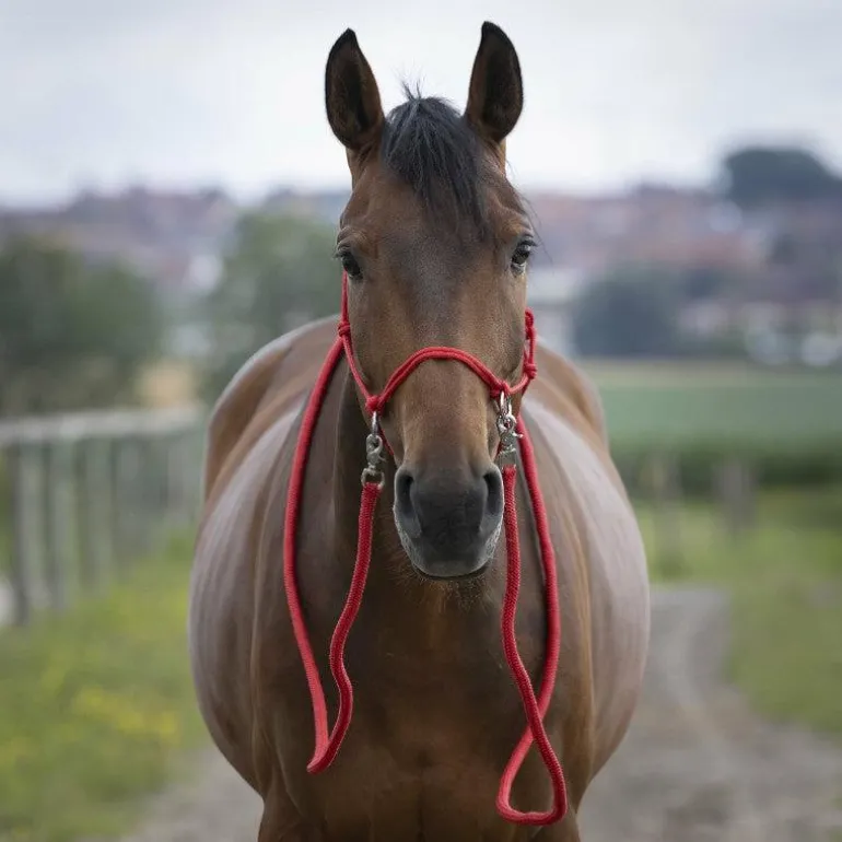 - Licol éthologique pré-noué en polypropylène équipé de 2 anneaux en acier chromé sur la muserolle pour fixer les rênes