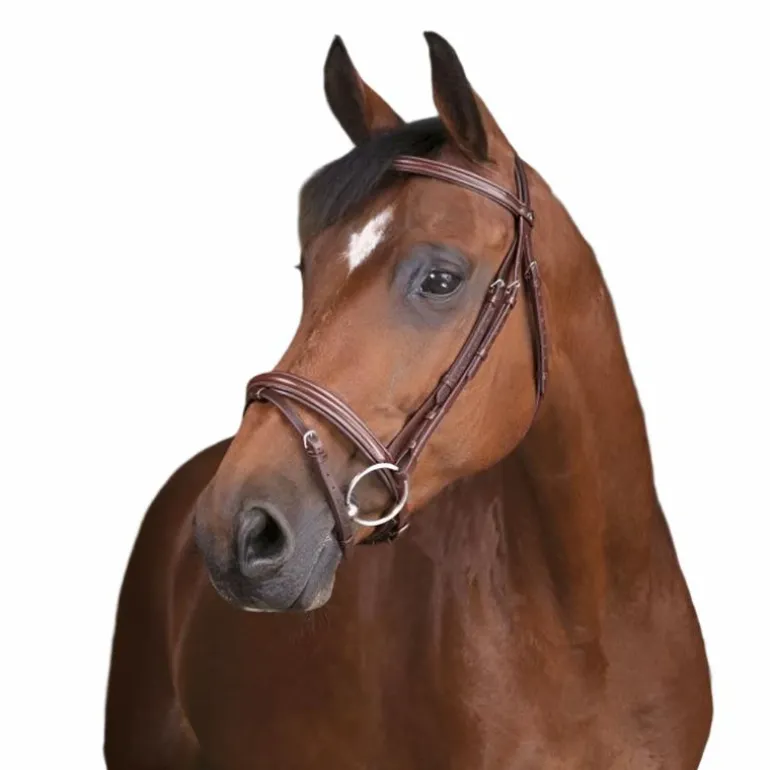 - Têtière découpée, frontal et muserolle combinée doublés cuir vachette, coutures blanches, crochets sur les montants de mors.
