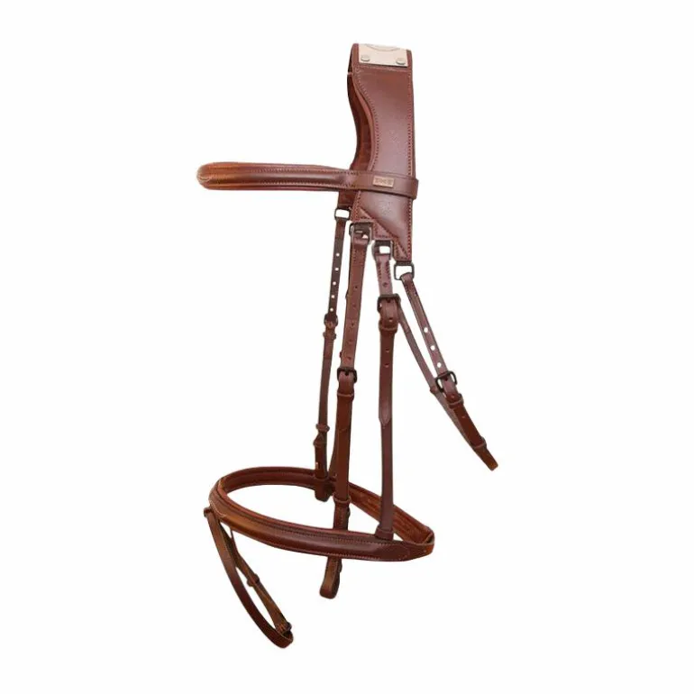 - Têtière triple équipée d’un pont afin de libérer totalement les cervicales de toutes pressions. Système de D pour l’attache des montants de mors et de muserolle