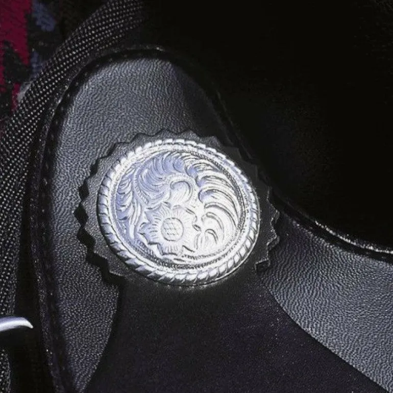 • Équipée d’étriers larges en P.V.C., d’une bouclerie en inox avec anneaux de fixation de sangle arrière et décorée de rosettes en acier nickelé