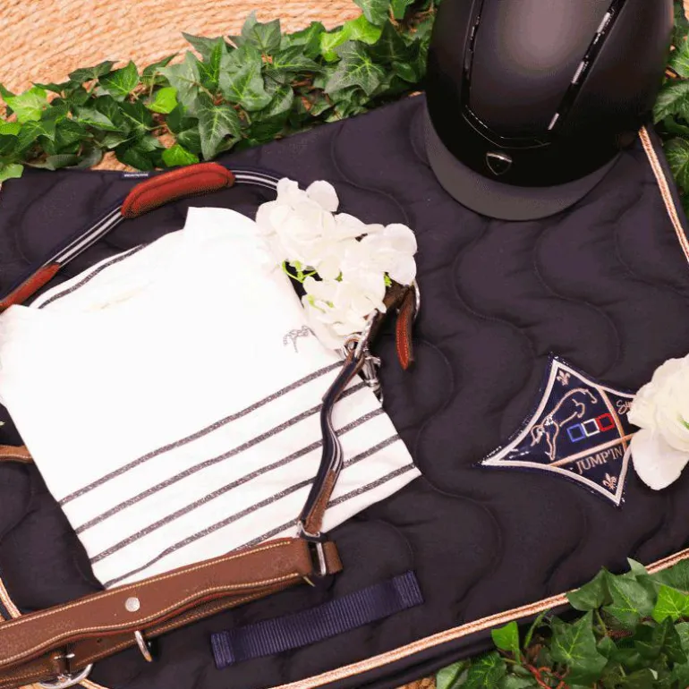 - Les empiècements élastiques marine sur la têtière et les joues sont placés stratégiquement de façon à inhiber au maximum le phénomène de « butée » pouvant intervenir lors des mouvements de tête à l’attache.