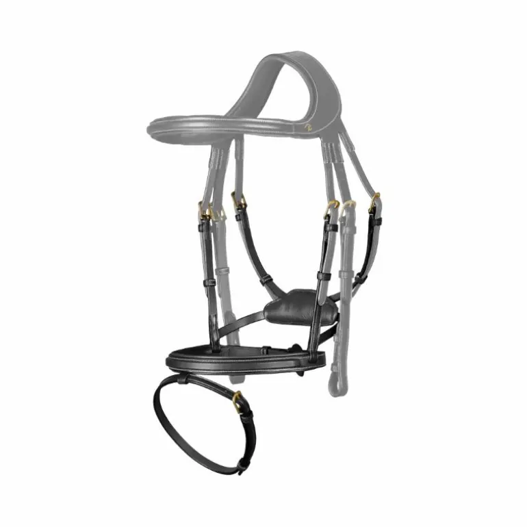 • Système de sous-gorge unique reliée à la muserolle afin de garantir le maintien de la têtière à l’arrière de la 2ème cervicale (cette sous-gorge doit être fermement ajustée sur les joues)