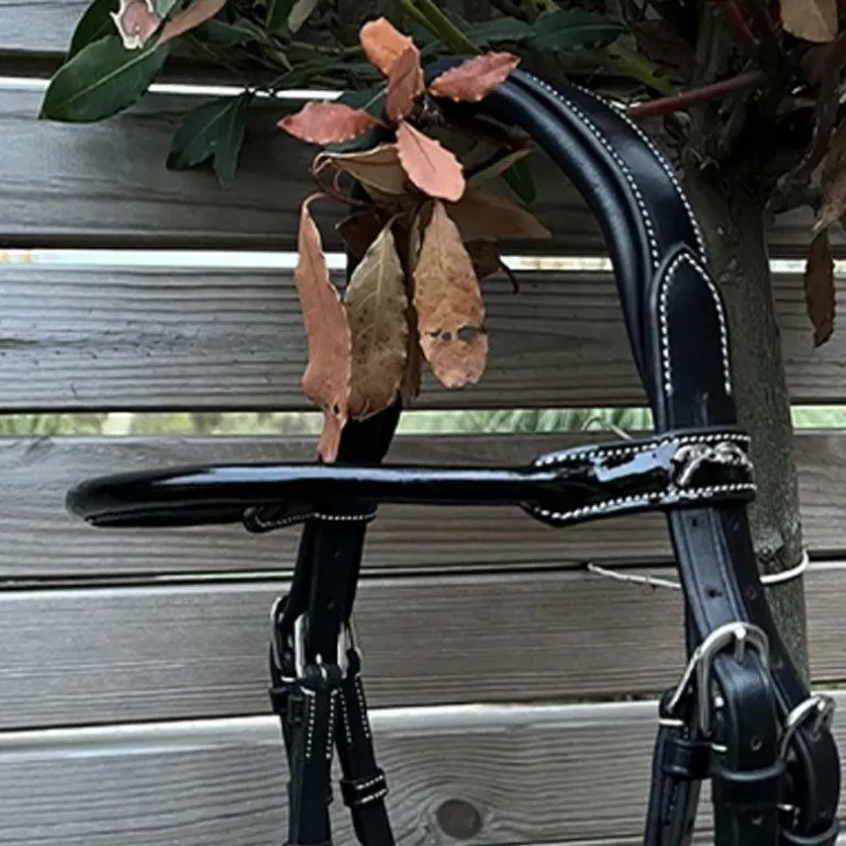 - Il est doté d’un frontal rond verni, d’une têtière anatomique et d’une muserolle large bien doublée ornée d’un insert verni surmonté d’un point crème.