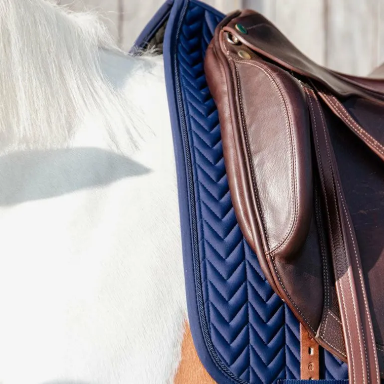 - Ce tapis de selle au matelassage Fishbone est fabriqué dans un matériau respirant (43% de nylon, 43% de polyester et 14% de spandex) et est dès lors, parfait pour la compétition ou l’entrainement à la maison. Vous pouvez d’ailleurs remplacer le patch avec les numéros par un patch au Logo Kentucky