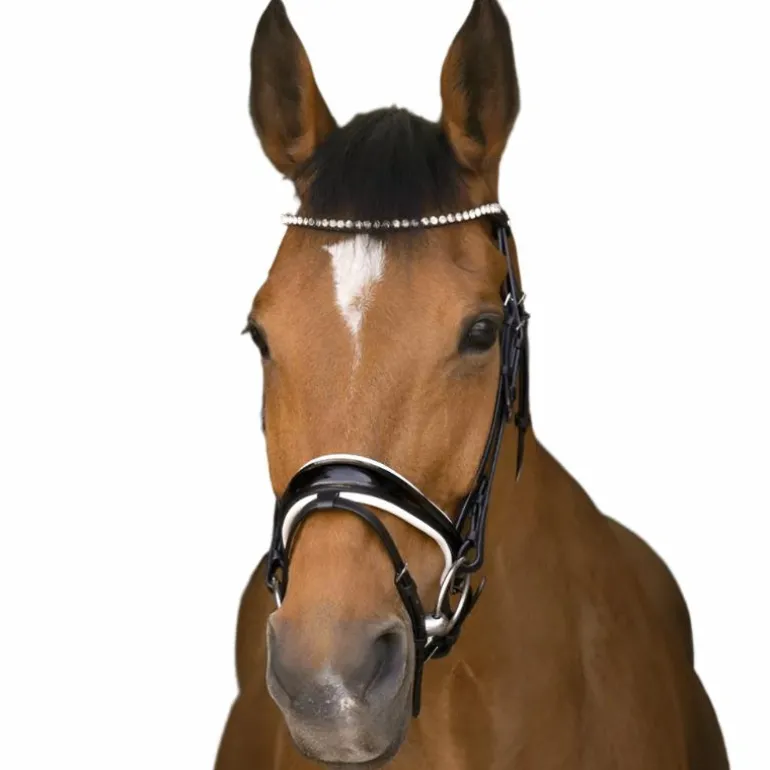 - Frontal fin décoré de strass et muserolle suédoise combinée aspect cuir vernis, doublés cuir vachette blanc