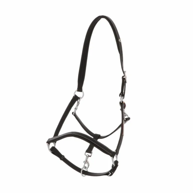 - Licol avec têtière et muserolle réglables, matelassées et doublées cuir ton sur ton avec surpiqûres blanches décoratives