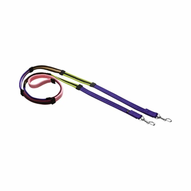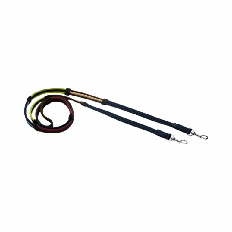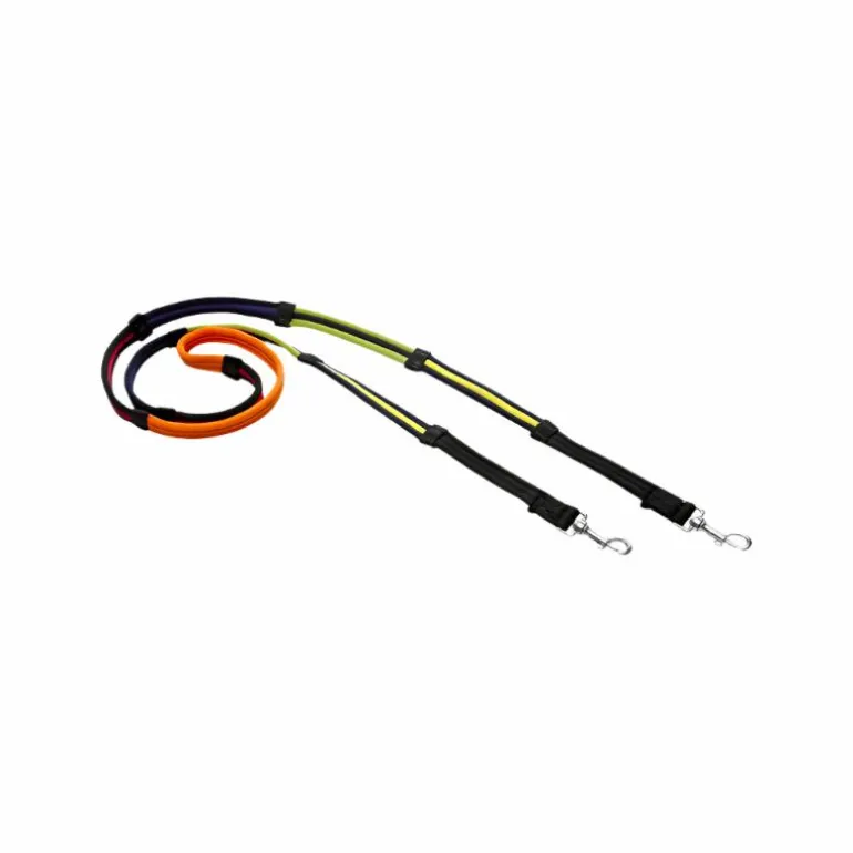 - Rênes matelassées en polyester, divisées en 4 sections de couleurs différentes avec arrêtoirs, pour faciliter l’apprentissage du positionnement et de la fixité des mains