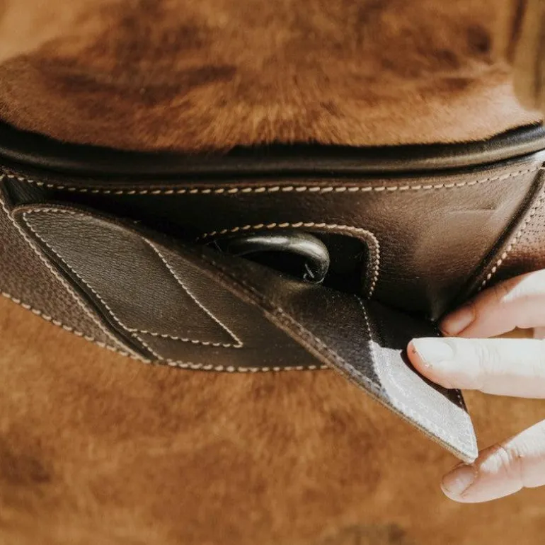 • Mousqueton centré et caché par un flap en cuir de buffle aimanté