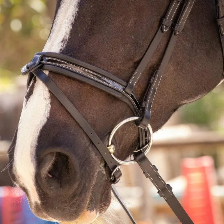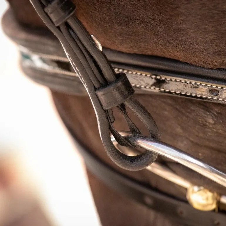 - La têtière est légèrement large pour répartir la pression sur la nuque du cheval. Le bridon smoothie est vendu avec sa paire de rênes.