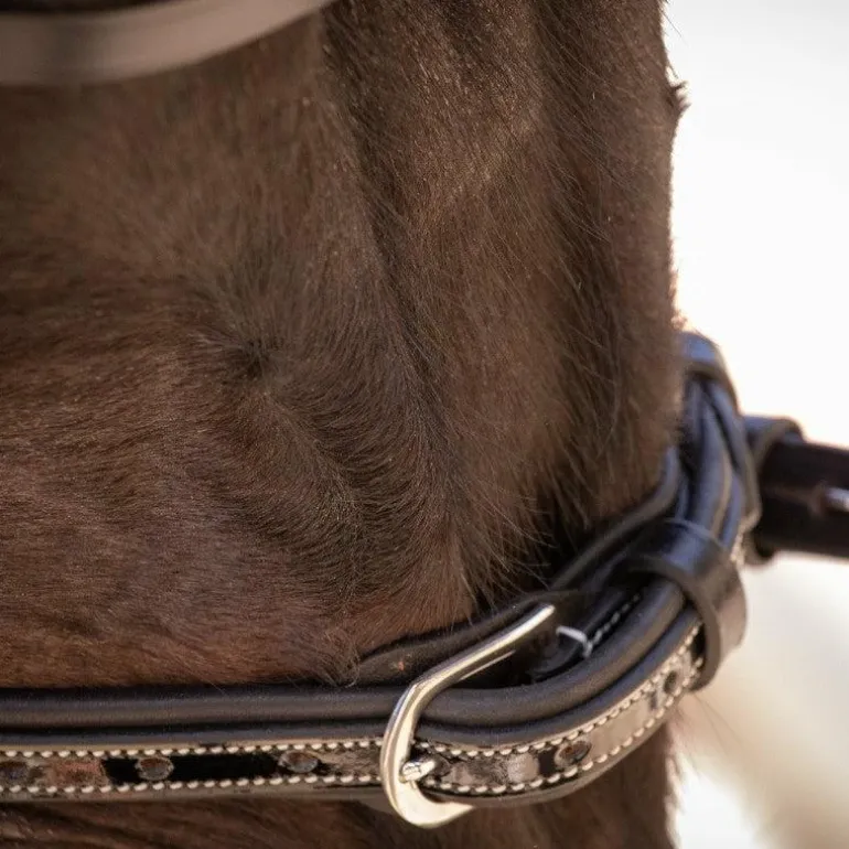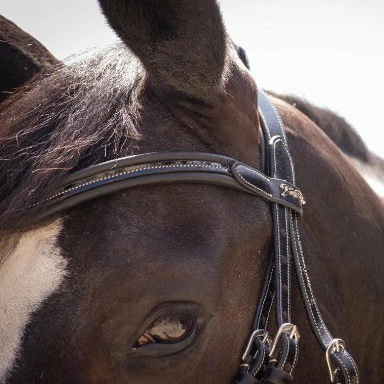 - Bridon Pénélope en cuir avec têtière, frontal et muserolle ornés d’une surpiqûre crème en contraste et doublée de cuir souple, y compris à l’arrière.