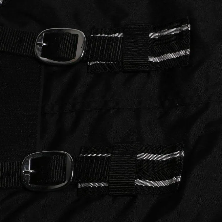 - Fermeture de poitrail réglable par sanglons et boucles, renforcée par bande auto-agrippante