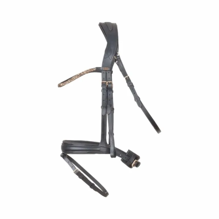 - Bridon à la têtière reculée et large afin de dégager les oreilles et répartir les pressions au niveau de la nuque